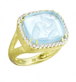 14kt Green Gold Ring Featuring Aqua Venetian Glass Backed with White Mother of Pearl Depicting Ganymede and the Eagle Story. Encompassed by .37pt Halo of Diamonds.
